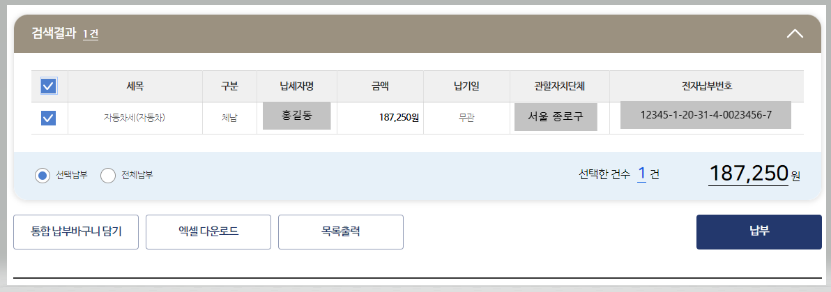 저의 경우 체납 건이 하나 있어서 확인했고 해당 건을 체크해서 하단의 '납부' 버튼을 눌러서 납부를 바로 진행하시면 됩니다. (여러 건인 경우 '통합 납부 바구니 담기로 가능)