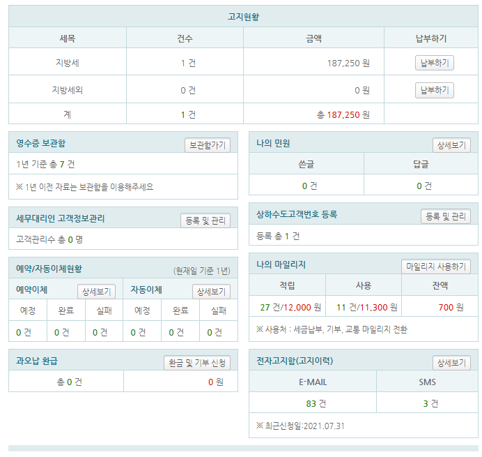 저의 경우 금융인증서를 통해 간편하게 로그인을 완료하였더니 바로 보이는 '나만의 이택스' 메뉴에서 납부할 지방세의 금액과 건수를 바로 확인할 수 있었습니다.