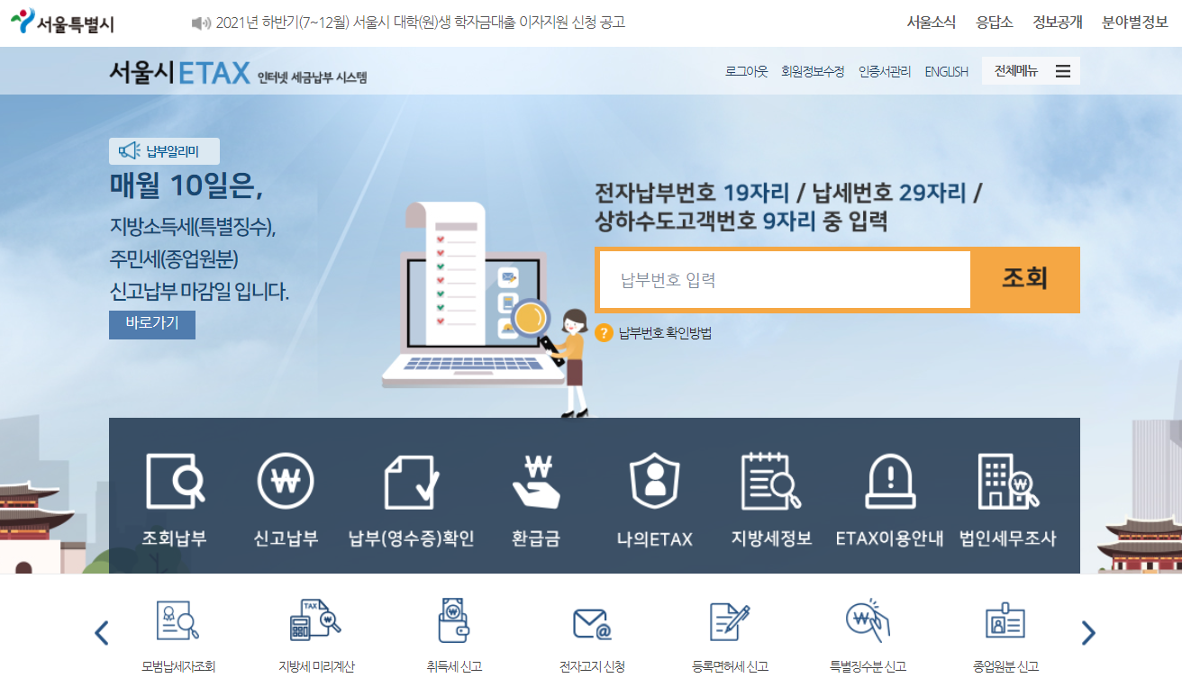 서울시의 경우는 인터넷 세금납부 시스템인 ETAX 이택스를 따로 운영하고 있어 위택스가 아닌 이택스를 이용해서도 지방세인 자동차세의 납부가 가능합니다.