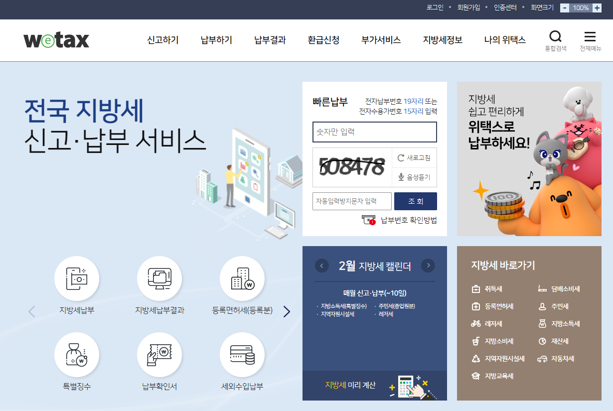 대한민국 행정안전부가 개발한 전국 지방세를 신고 납부하는 서비스를 제공하고 있는 wetax 위택스 홈페이지를 찾아 로그인합니다.
