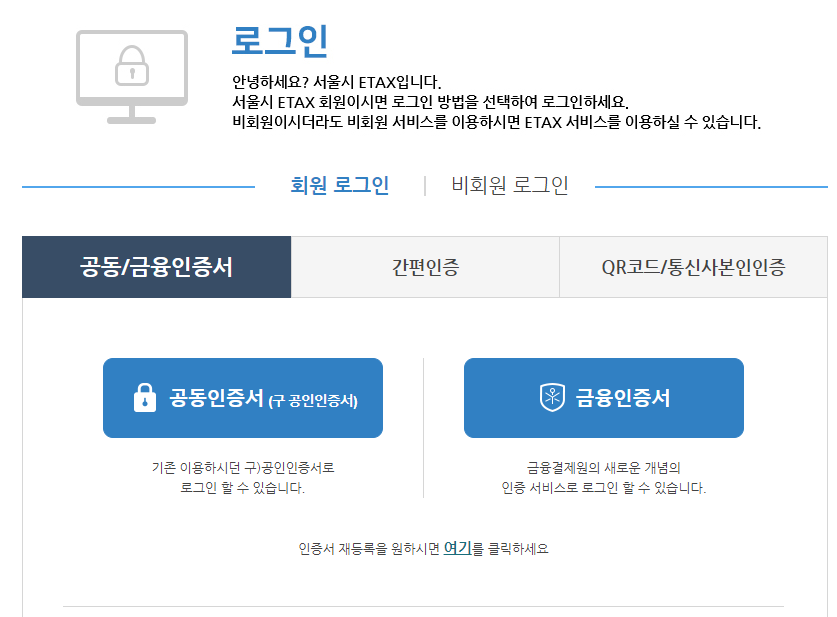 이택스 홈페이지에 접속 후 로그인을 눌러 공동/금융인증서, 간편인증 및 QR코드/통신사 본인인증 중에서 선택해서 로그인을 완료하시기 바랍니다.