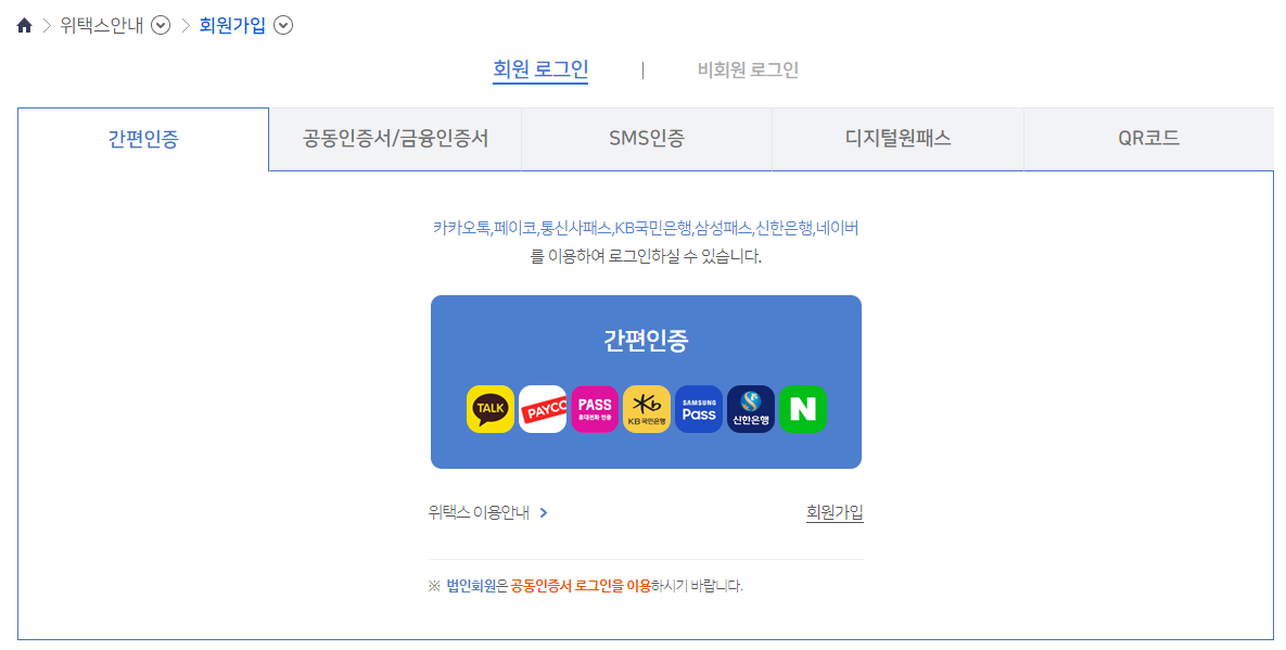 위택스 로그인은 간편인증, 공동 인증서/금융인증서, SMS 인증, 디지털원패스, QR코드 등 다양한 로그인 방식을 지원하고 있으나 본인이 가장 편리한 인증방식으로 로그인하시면 됩니다.