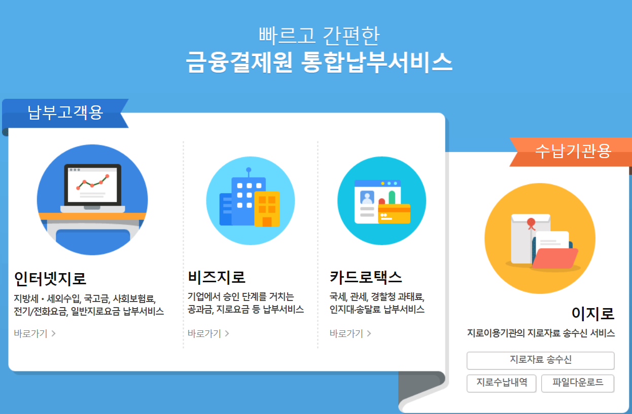 위택스와 이택스로도 부족하신 분들은 이미 인터넷지로를 이용해서 납부하시는 분들이 있을 것 같습니다. '인터넷지로'로 검색해서 금융결제원 통합납부서비스를 찾아가십시오.