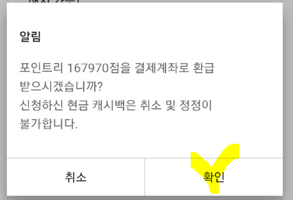 신청을 클릭하면 입력한 포인트리를 숫자만큼 결제계좌로 환급받으시겠습니까? 라는 팝업(Pop-up) 창이 나옵니다. 확인 버튼을 눌러주세요. 단, 신청한 현금 캐시백은 취소나 정정은 되지 않습니다.