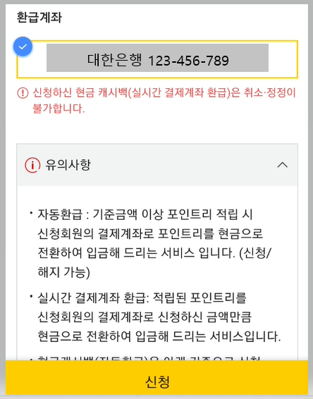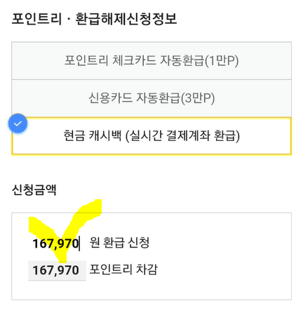 저는 상기의 선택에서 '현금 캐시백'을 선택하였습니다. 신청금액에 환급 신청할 금액을 입력하시면 입력한 금액에 상당하는 포인트리 차감이 이루어진다고 생각하시면 됩니다.