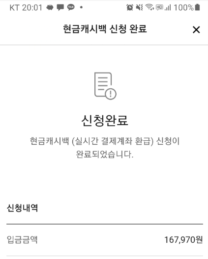 현금 캐시백 신청 완료 화면에서 환급계좌로 입금금액이 송금되었다는 내용인데요. 화면 아래에 확인 버튼을 눌러서 종료한 다음 이제 실제 은행 계좌에 입금이 완료되었는지 추가로 확인하시면 됩니다.