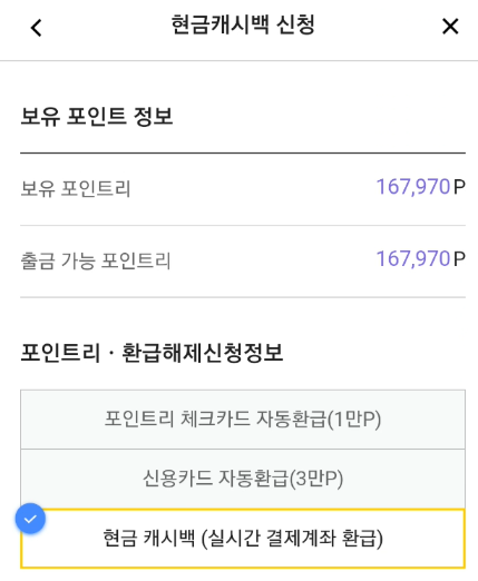 현금 캐시백 신청 화면에서 현재 보유 중인 포인트리와 출금 가능한 포인트리 포인트 정보를 확인하신 다음 포인트리 환급 해제 신청정보에서 다음 중 하나를 선택해주셔야 합니다.
