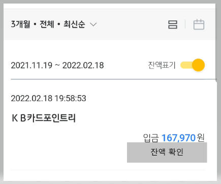 그럼 지금까지 KB 국민카드 앱을 통해서 포인트리를 현금캐시백으로 전환 신청하는 방법에 대해 알아보았습니다. 이게 될까? 했는데 실제 포인트가 현금화가 되어 계좌로 입금이 되니 이러려고 포인트를 모았나 하는 생각이 드는 하루였습니다.