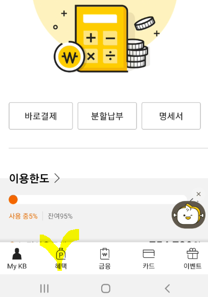 KB국민카드 앱의 첫 화면인 My KB에서 하단의 '혜택' 아이콘을 눌러서 카드이용 실적 및 혜택이라는 제목의 화면으로 이동하시기 바랍니다.