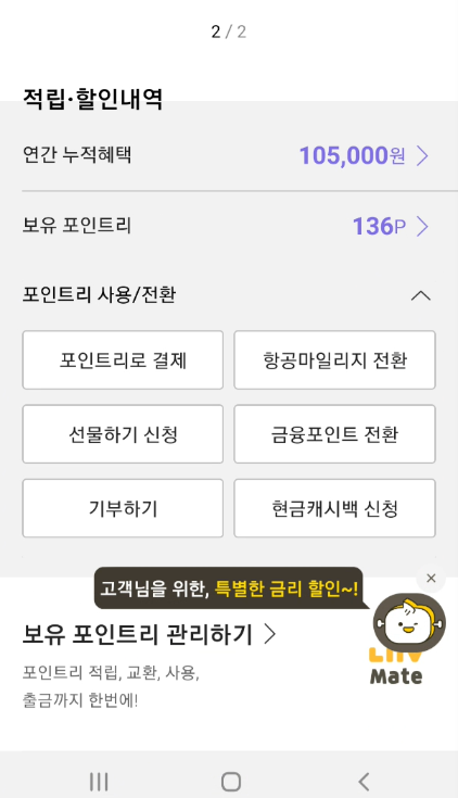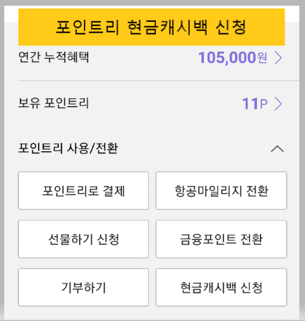 혜택 메뉴의 화면에서 카드별로 이용실적 및 혜택 확인이 가능합니다. 연간 누적 혜택도 보시고 보유 포인트리 아래에 포인트리 사용/전환 항목에서 '현금 캐시백 신청'을 눌러주시기 바랍니다.