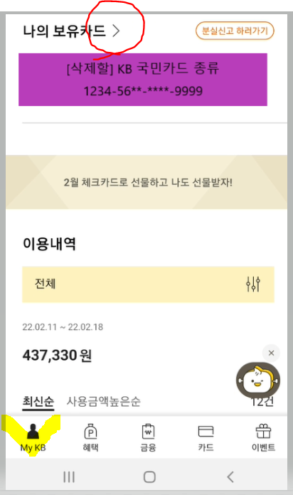 My KB 화면에서 나의 보유카드를 확인합니다. 여러 장이 있는 경우는 손으로 터치해서 좌우로 이동하면서 해지할 카드를 찾으시면 됩니다.