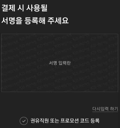 결재 비밀번호 이후 지문 등록은 불필요하여 생략하였고요. 결제 시 사용될 서명을 등록해주셔야 합니다. 서명 입력란에 손끝으로 서명을 그려주시면 됩니다.