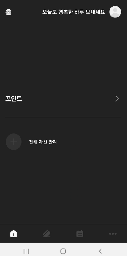 KB Pay 모바일 앱 설치에서 서비스 가입 후 오픈뱅킹 자산인 계좌들을 등록하고 난 뒤에 KB 페이 홈 화면의 모습입니다. 첫 시작이기 때문에 포인트, 전체 자산관리 항목만 보이고 아직 조회되는 것이 없습니다.