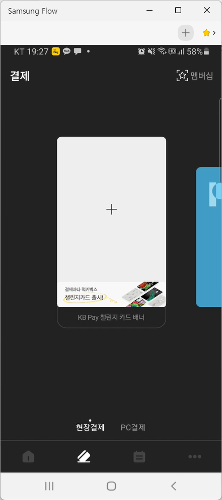 KB Pay 홈 화면 옆 메뉴는 결제 메뉴입니다. 사실 상 페이 서비스의 역할은 결제 메뉴에서 담당하게 될 것인데요. 현장 결제와 PC 결제로 구분되어 있고 페이로 등록된 계좌와 신용카드 정보를 이용해서 바로 페이 결제 처리가 가능합니다.
