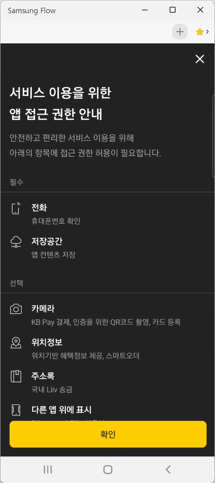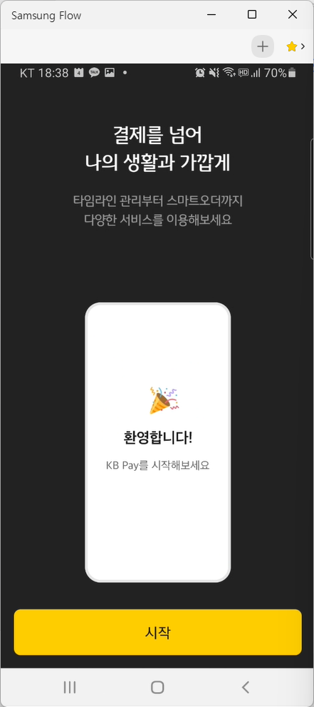 확인 버튼을 누르고 전화 및 사진, 미디어, 파일 액세스 등에 허용해주시면 KB Pay 앱은 시작됩니다. 첫 시작시에 KB 페이에 대한 안내 내용이 나오니 감상하신 후에 '시작' 버튼을 누르세요.