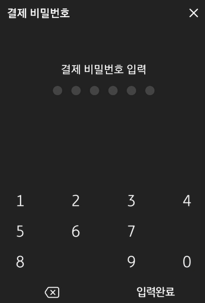 앞으로 사용할 결제 비밀번호 입력이 필요합니다. 6자리 숫자를 결재 비밀번호 확인을 위해 2회 반복해서 입력해주시면 됩니다.