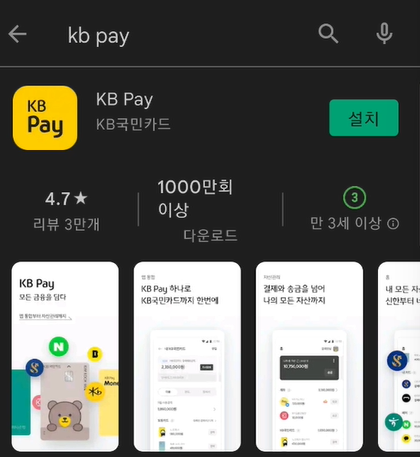 KB Pay(KB국민카드) 앱을 찾으신 다음 설치 버튼을 누르고 다운된 앱의 설치가 완료되면 바로 열기를 눌러 KB Pay 앱을 시작해주시기 바랍니다.
