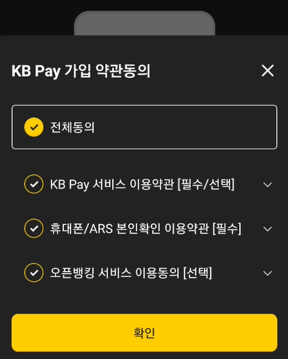 시작 버튼을 누르면 kb pay 가입 약관동의 화면이 보입니다. 전체 동의에 체크하신 다음 확인 버튼을 눌러주시기 바랍니다. 여기서 오픈뱅킹 서비스 이용 동의는 선택이기 때문에 필요 없는 경우는 선택을 제외하세요.