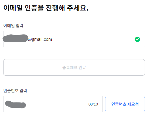 이메일 인증을 진행해 주세요. 화면에서 이메일을 입력한 다음 중복체크를 한번 하시고 '인증번호 요청' 버튼을 눌러서 본인 이메일 수신함으로 가서 코인원이 발송한 이메일 본문에서 인증번호를 찾아 입력해 주시면 됩니다.