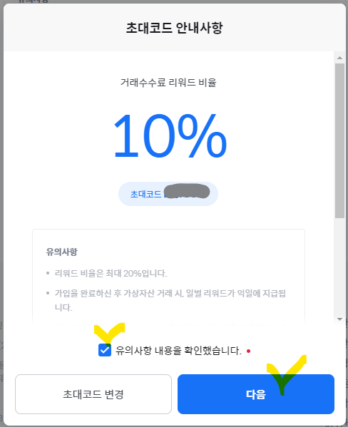 본인인증 진행을 위한 선택이 끝나고 초대 코드가 있는 경우는 다음 화면인 '초대 코드 안내사항'을 확인하십시오. 거래수수료 리워드 비율이 10%라고 나오네요. '유의사항 내용을 확인했습니다.'에 체크하고 다음을 눌러주세요.