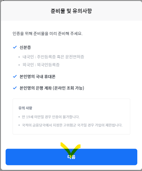 인증을 위한 준비물은 신분증, 본인 명의 국내 휴대폰 그리고 온라인 조회 가능한 본인 명의 은행 계좌 3가지로 다음과 같습니다. 단, 만 19세 미만인 경우는 인증이 불가합니다.