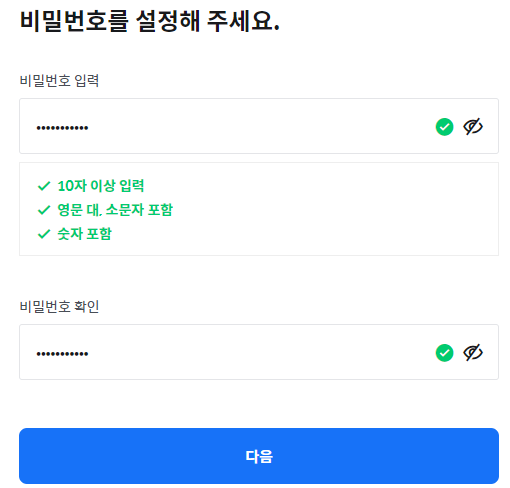 이메일 인증이 끝나면 다음은 비밀번호를 설정하는 단계입니다. 비밀번호의 규칙을 잘 준수하는 패스워드를 2회 동일하게 입력해서 넘어가시면 됩니다.