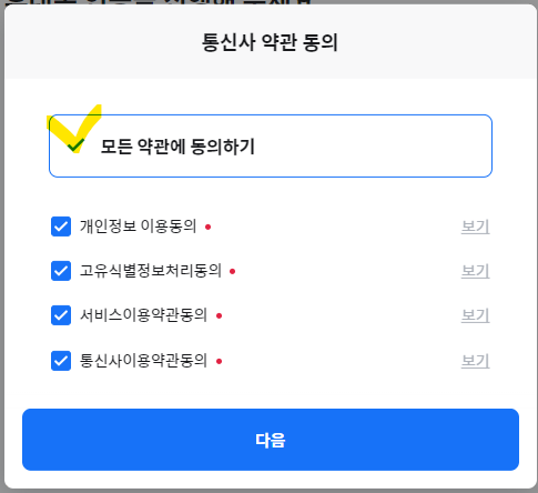 다음은 통신사 약관 동의 화면입니다. '모든 약관에 동의하기'를 선택한 후 '다음' 버튼을 눌러서 계속 진행하시기 바랍니다.