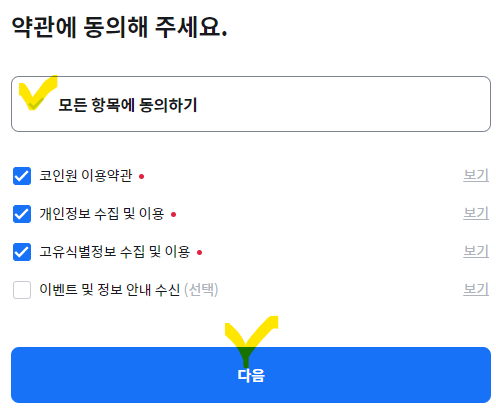 다음은 '약관에 동의해주세요' 화면입니다. 모든 항목에 동의하기 체크 후 선택사항만 체크를 그냥 둘지 제거할지만 결정하시고 다음을 눌러주시면 됩니다.