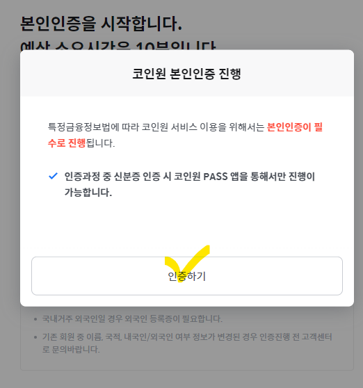 홈페이지 우측 상단의 회원가입을 클릭합니다. 아래와 같이 '코인원 본인인증 진행'이라는 팝업(Pop-up) 화면이 나타나면 '인증하기'를 눌러서 화면에 안내된 가이드에 따라서 진행하시면 됩니다.