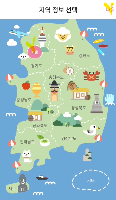 다음은 본인이 거주하는 지역을 선택하는 지역정보 선택 화면입니다. 지도 이미지로 되어있어 마우스로 해당 지역을 클릭하여 선택하고 '다음'을 눌러주면 됩니다.