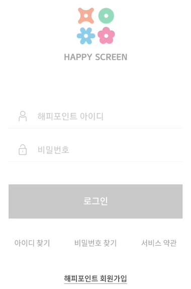 해피스크린은 해피포인트와 별도로 계정이 있는 것이 아니라 같은 계정을 사용하기 때문에 기존에 가입했던 해피포인트의 아이디와 비밀번호를 입력하고 로그인 버튼을 눌러서 시작하시면 됩니다.