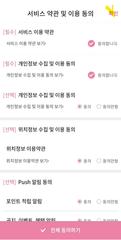 해피포인트 아이디와 비밀번호를 입력하고 로그인을 누르면, 서비스 약관 및 이용 동의 화면이 나옵니다. 필수 항목들에 대해서는 모두 동의를 체크하신 후 '확인'을 눌러주세요.