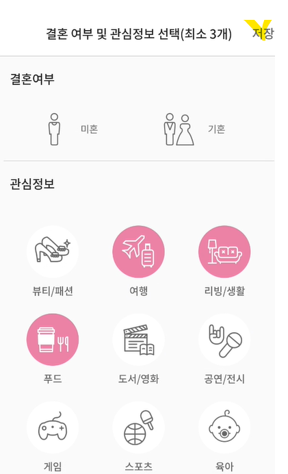 - 결혼 여부 및 관심정보 선택 (최소 3개)