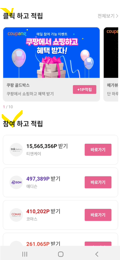 포인트 충전소에서는 지금 적립 가능한 혜택을 포인트로 환산해서 보여주는데요. 클릭하고 참여하는 등의 방법을 이용해서 포인트를 받고 적립하실 수 있습니다.