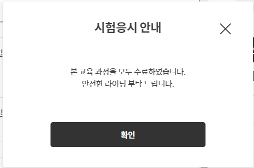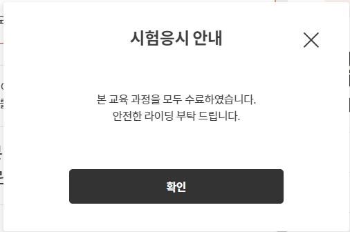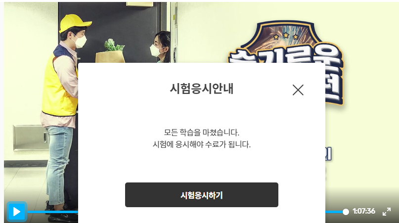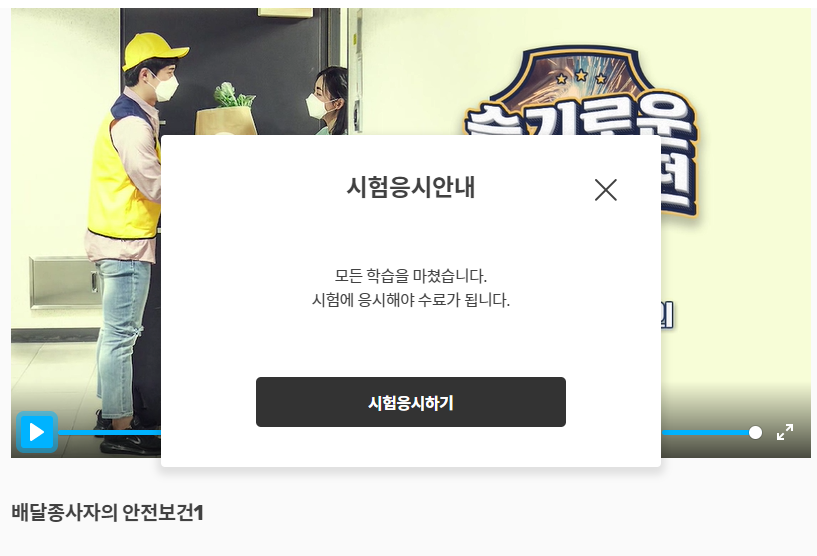 배달종사자의 안전보건 1 교육과 시험을 모두 완료하시면 다음과 같이 본 교육 과정을 모두 수료하였다는 안내 화면을 만나시게 될 겁니다.
