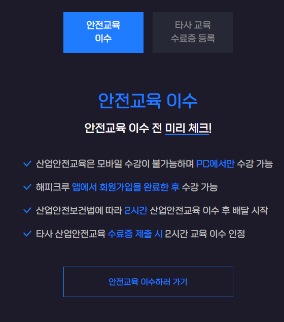 해피 크루 배달 앱의 회원가입 후 산업안전교육을 이어서 수강하는 방법에 대해 알려드리고자 합니다. 해피 크루 가입 후 초기 설정 과정에서 산업안전교육을 미 이수하신 분들은 본 내용에 따라 수강을 완료하시기 바랍니다.