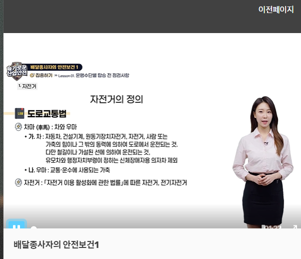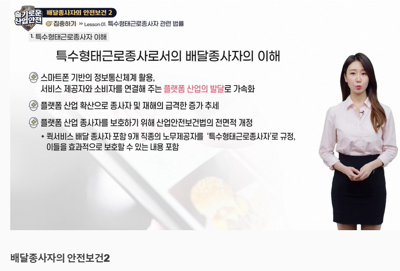 안전보건 1 과정은 특수형태 근로종사자 관련 법률과 작업 상황별 발생할 수 있는 사고사례 시 대처방법 그리고 12대 중과실 교통사고에 대해 공부할 수 있다고 합니다. (약 1시간 36분가량 소요)