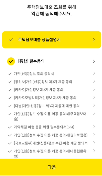 나의 한도 확인하기를 누른 후 약관 동의 화면에서 주택담보대출 상품설명서, [통합] 필수 동의 등 항목에 체크를 하고 나오는 약관 화면을 다시 확인해주는 방식으로 진행합니다.